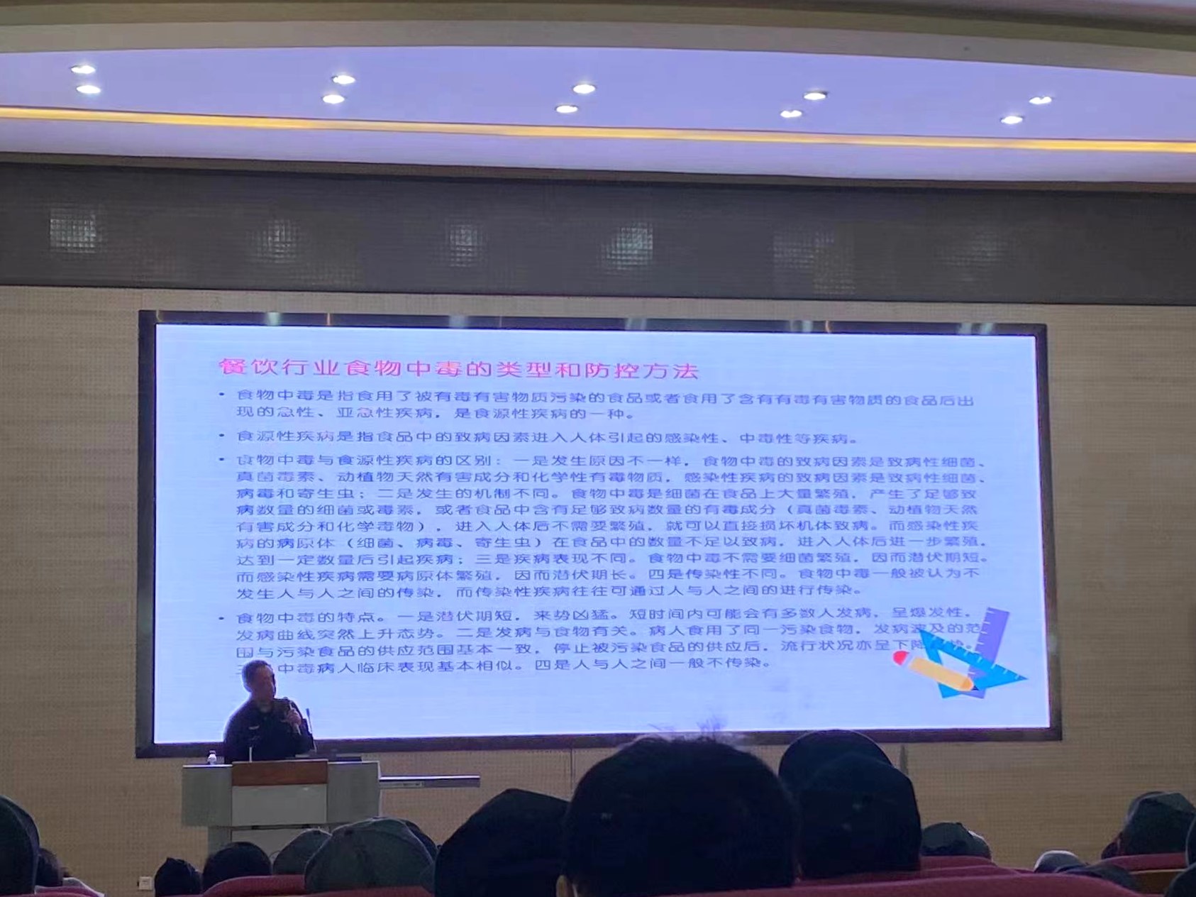 苏展就餐饮服务中如何预防食物中毒进行了详细讲解。苏展以习近平总书记关于食品安全工作重要指示为开端,强调了食品安全的重要性,着重介绍了餐饮行业食物中毒的类型和防控方法,讲解了危害分析与关键控制点体系原理在餐饮服务业的应用。培训会现场,校区食品从业人员认真听介绍,并记下知识要点,表示受益匪浅。