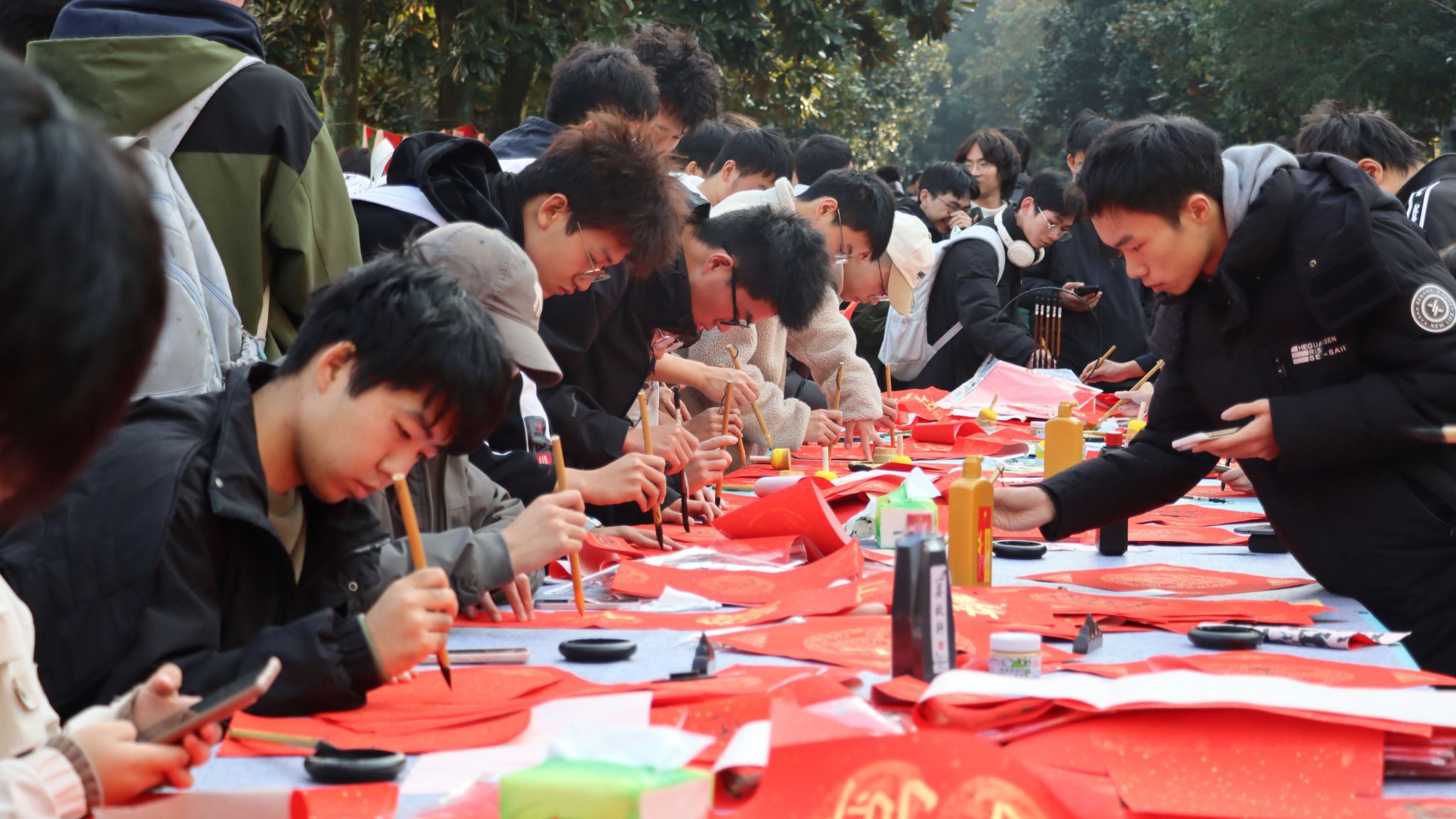 活动还吸引了一位书法精湛的老校友参与,许多同学现场向他求字,他热情慷慨地为同学们献上“墨宝”,送去祝福。来自艺术学院的学生志愿者王茂丁感慨道:“这种不期而遇的美好瞬间,就是我参与志愿服务最大的收获。我在大家一笔一划的书写中,感受到了传统文化的传承与魅力。”