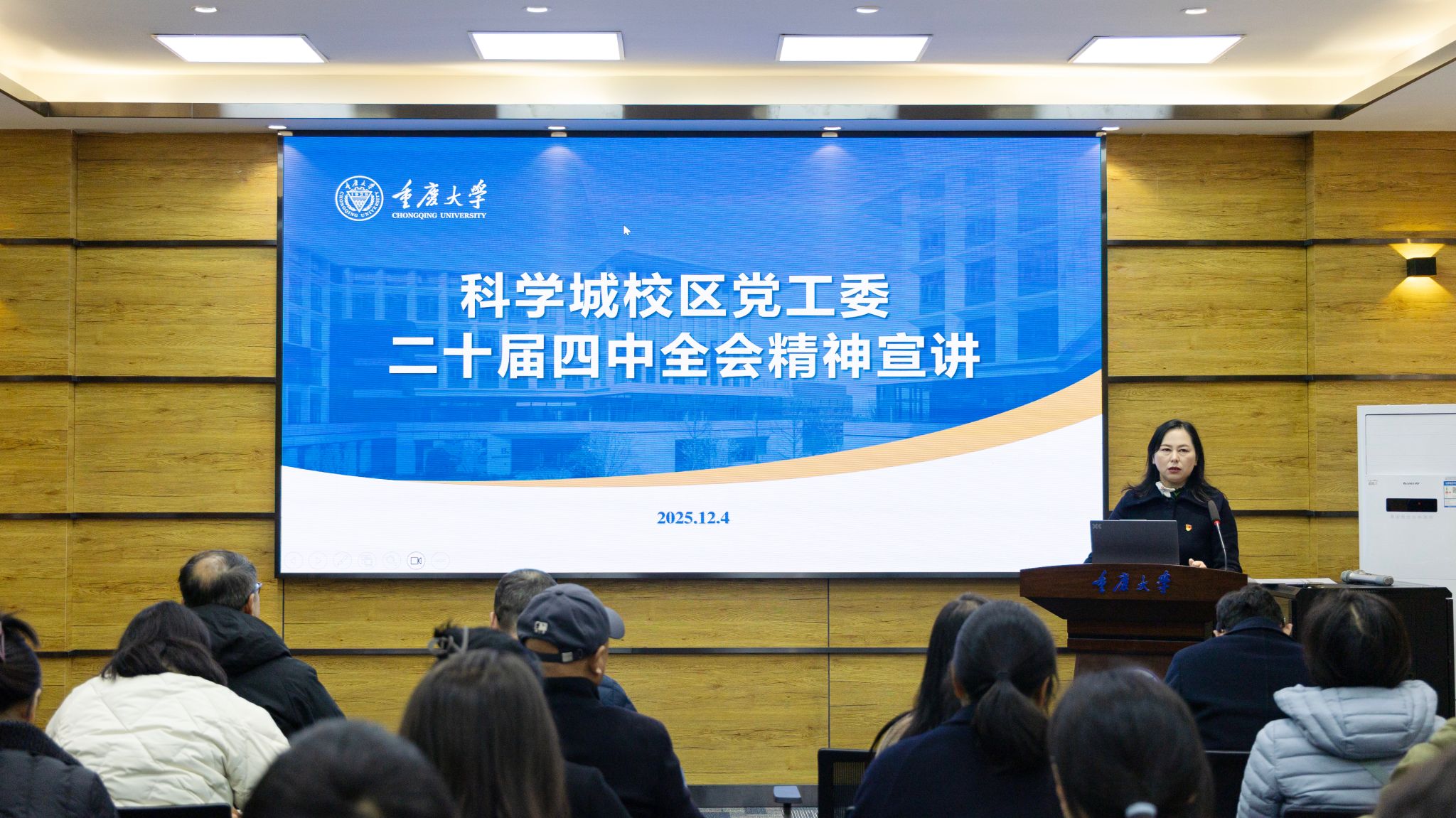 12月4日,科学城校区党工委学习贯彻党的二十届四中全会精神宣讲报告会在虎溪校园综合楼Z228会议室举行。科学城校区党工委书记尹国华作宣讲报告,科学城校区管委会、分析测试中心、超瞬态装置实验室的党员、群众共计百余人参会。会议由科学城校区管委会主任华建民主持。